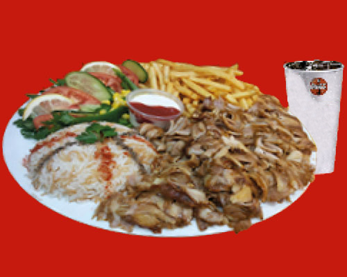 Carne Kebab con arroz, patatas y ensalada + Bebida