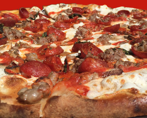 Peperoni, salami, jamón serrano, pimientos y champiñones.